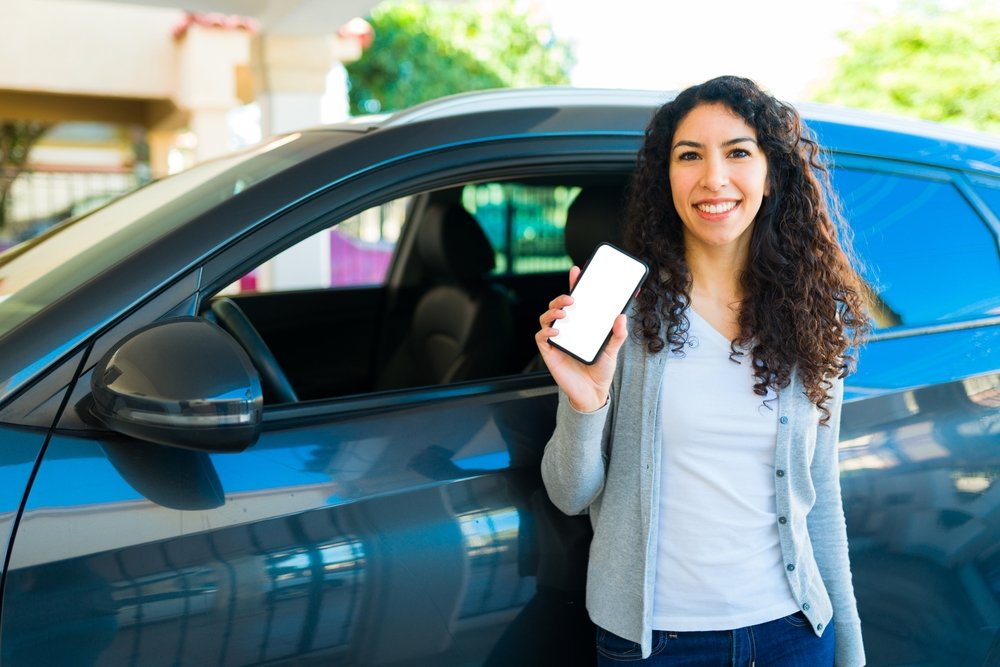 Início » Motorista de aplicativo pode ter proteção veicular? Saiba como proteger seu carro e sua renda com segurança » Portrait,Of,A,Happy,Latin,Woman,Using,The,Mobile,App